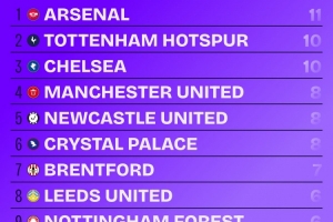 体育资讯2月13日讯 Squawka统计了本赛季各队在英超比赛中的头球进球数量,并列出榜单,阿森纳11球最多,热刺、切尔西10球次席。