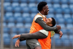体育资讯10月29日讯 在经历了国家德比一系列争议风波后,皇马阵中的气氛似乎已经重新回归平静。今日,皇家马德里官方社交媒体晒出球队训练照,画面中维尼修斯与贝林厄姆紧紧相拥,两人笑容满面,显得气氛融洽。