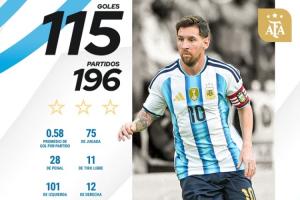 梅西国家队生涯196场打进115球,仍居国家队历史射手榜第二,榜首C罗143球。