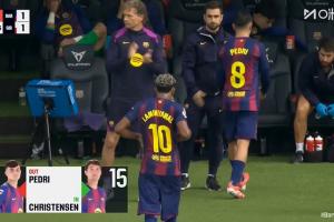 比赛第63分钟,亚马尔、佩德里被巴德吉和克里斯滕森换下。